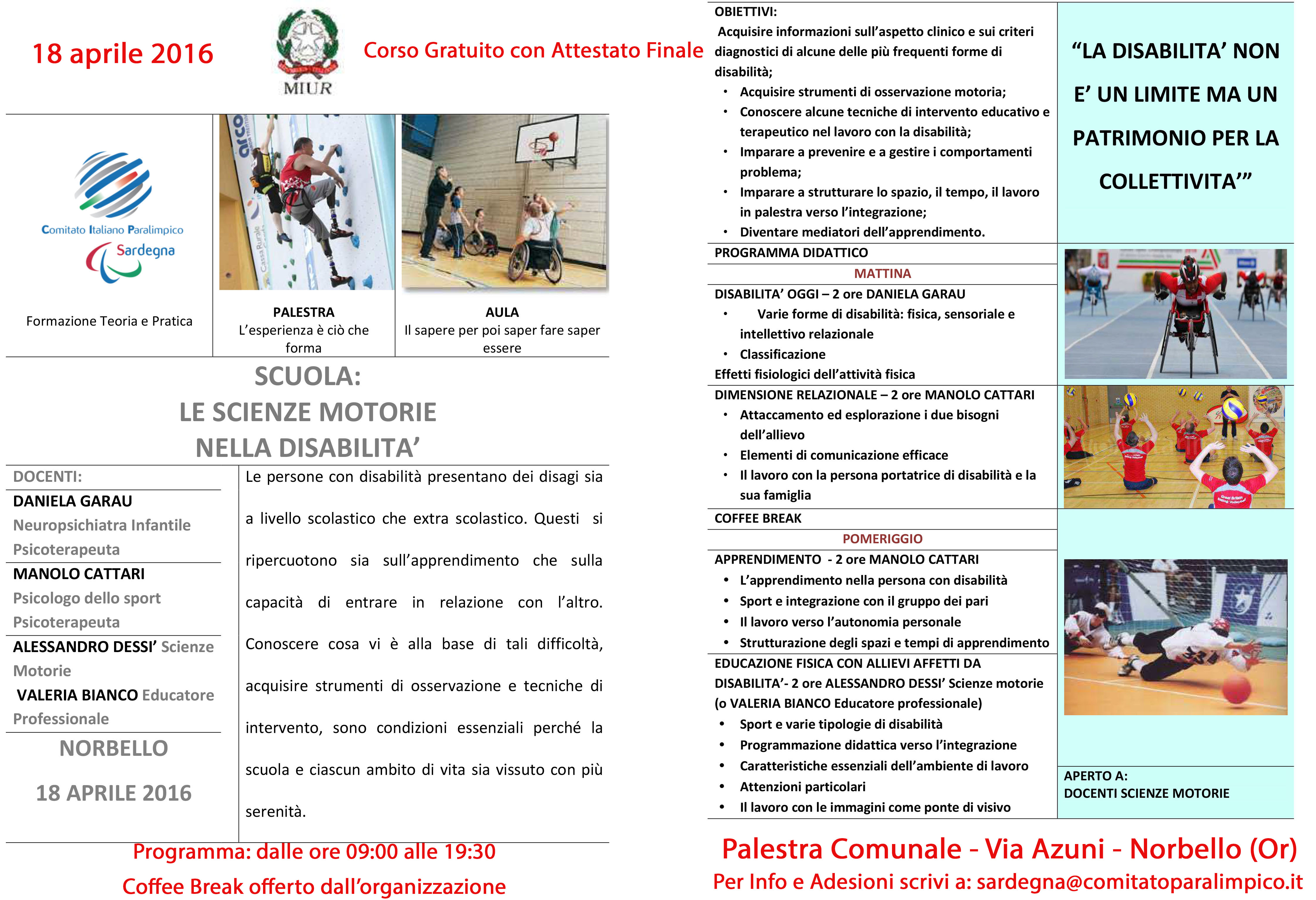 Il prossimo 18 Aprile, la palestra Comunale di Norbello ospiterà per tutta la giornata un interessante corso di studi dal titolo: “Scuole, le scienze motorie nella disabilità”. Il Prof. Marco Pinna responsabile regionale del settore scuola del Comitato Paralampico e coordinatore provinciale di Sassari dell’Ufficio Scolastico Regionale, spiega a GuilcerSport il perché dell’importanza di questa iniziativa a carattere regionale. “Abbiamo pensato fosse utile organizzare questo corso che ha come principali  destinatari i dirigenti scolastici delle scuole primarie e gli insegnanti di Scienze motorie. I relatori, spiega Pinna, affronteranno le principali tematiche con le quali si convive ogni giorno nel mondo della scuola quando tra gli studenti sono presenti ragazzi con disabilità.